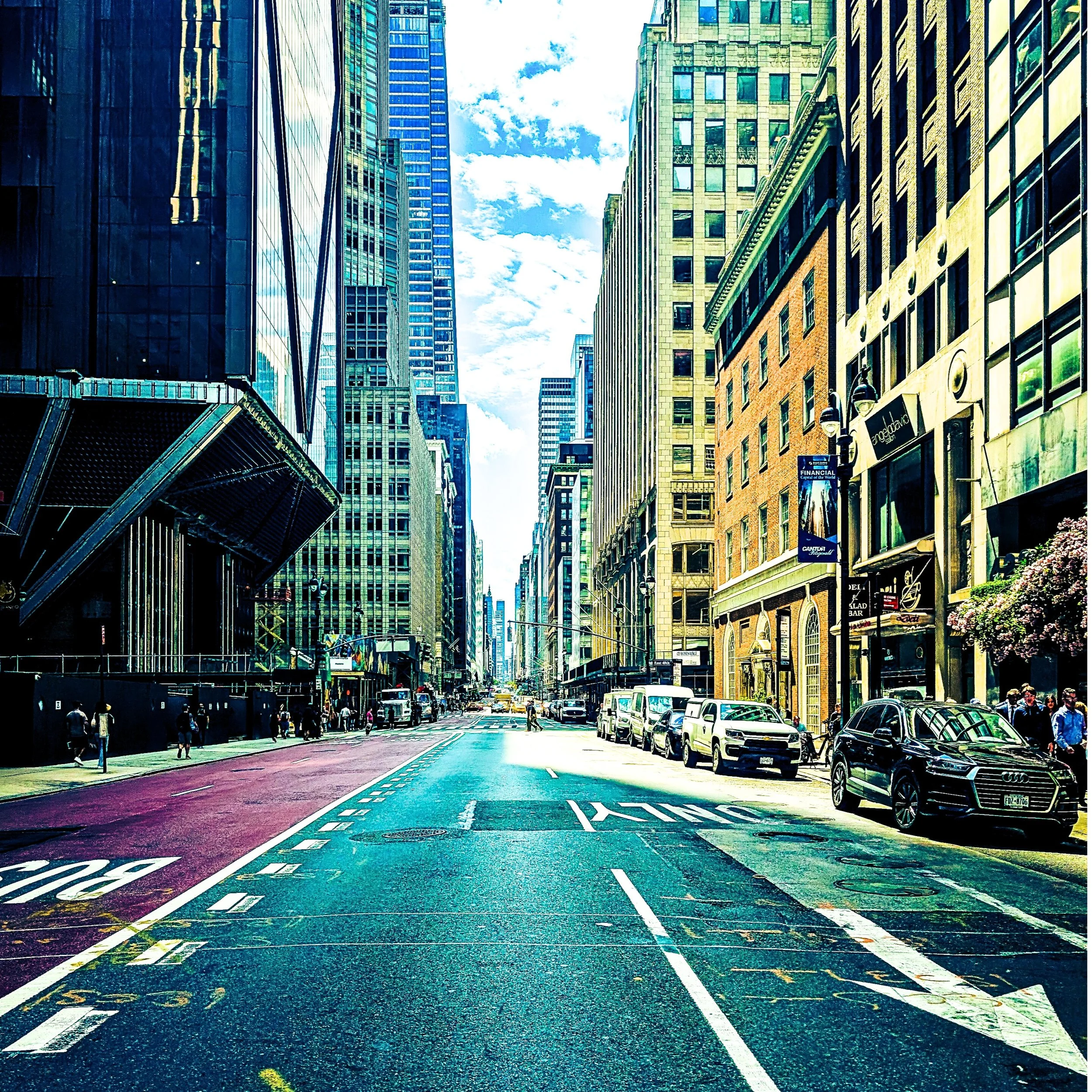 Urban Streetscape in Motion: A bustling city street with tall buildings lining the road. This dynamic shot of a nearly empty avenue captures the essence of urban life at its peak.